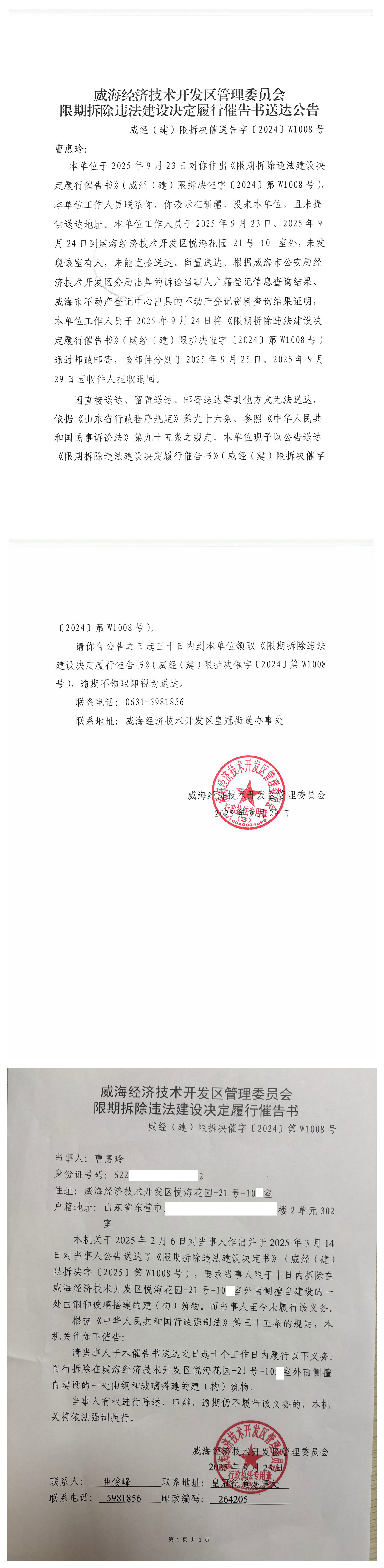 限期拆除違法建設決定履行催告書送達公告(威經(建)限拆決催送告字〔2024〕W1008 號)